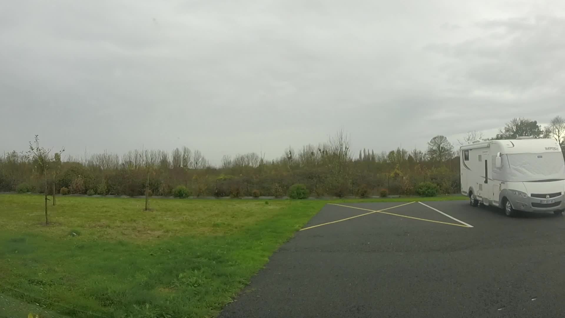 We arrived at the aire and parked, backing in so that we had a view of the small stream in front of us. Andy plugged the EHU in after checking the safety of the cable (which he had parked the rear wheel over at the previous but one aire, Le Mele sur Sarthe. It checked out safely and so we started to put the usual devices on charge and settled down with a coffee and the laptop to catch up with this blog as the rain started and and got steadily heavier as the evening drew darker and darker.