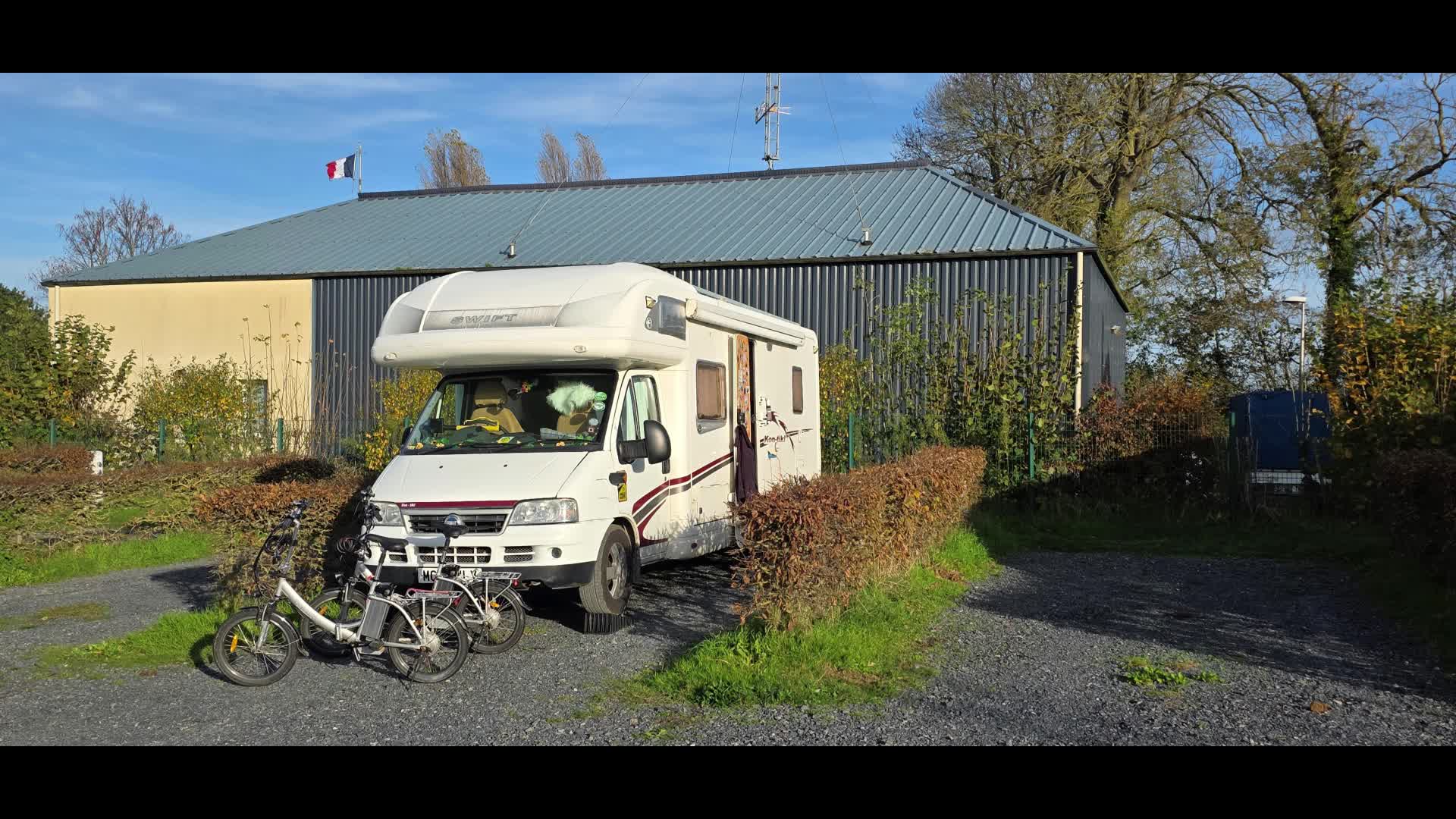 Everything was put on charge including the leisure battery for a few hours before getting road ready and driving over the service drain to empty and refill as usual, then off to the supermarche for supplies and onto Decathlon where we enjoyed some retail therapy, looking at bikes and equipment that we couldn't afford and didn't need anyway. We did, however buy a new saddle for Sue's e-bike as her old one had split and was soaking up the rain causing wet bottom syndrome! 😂