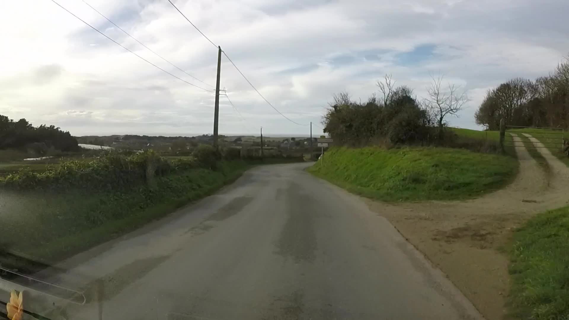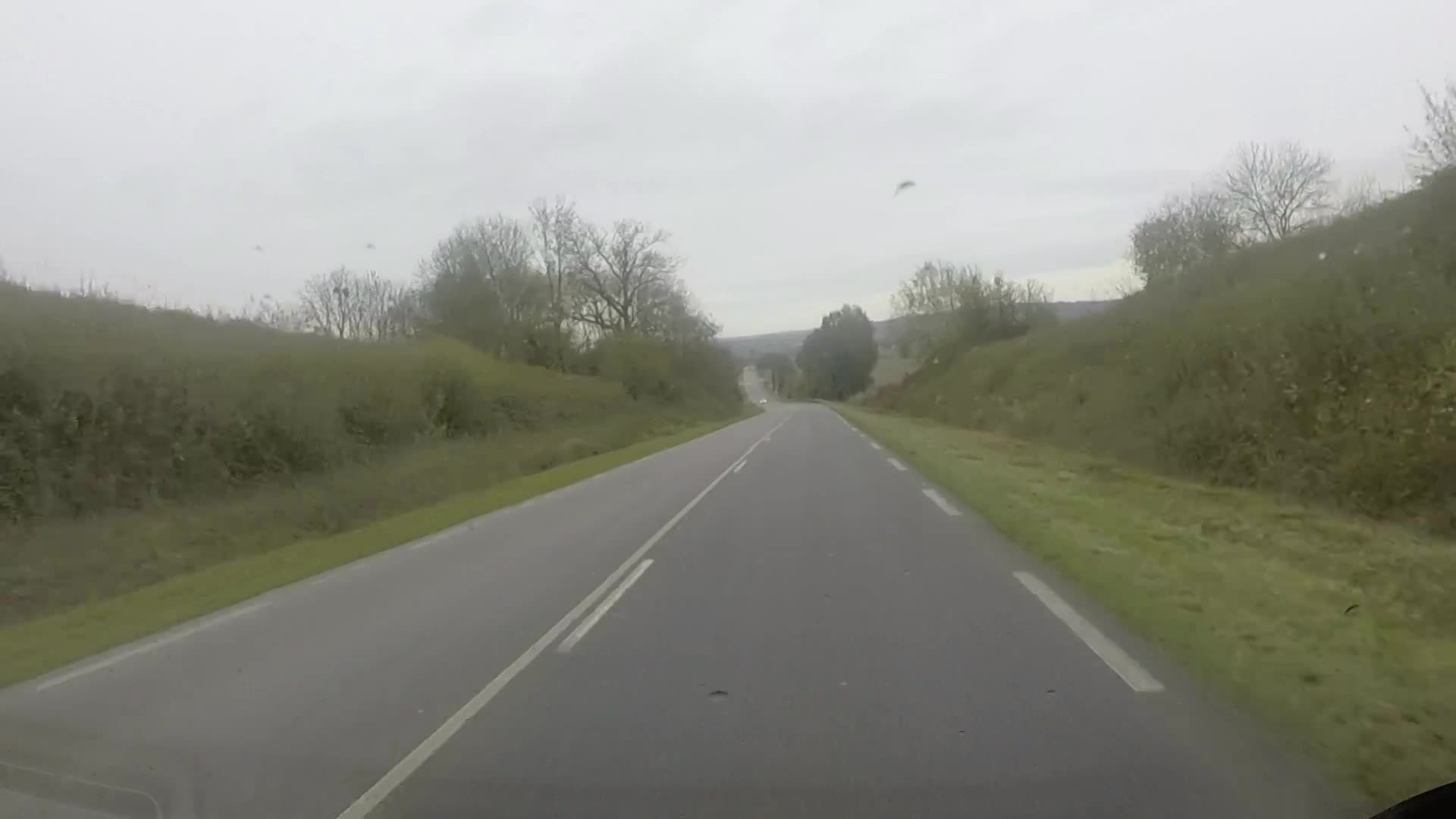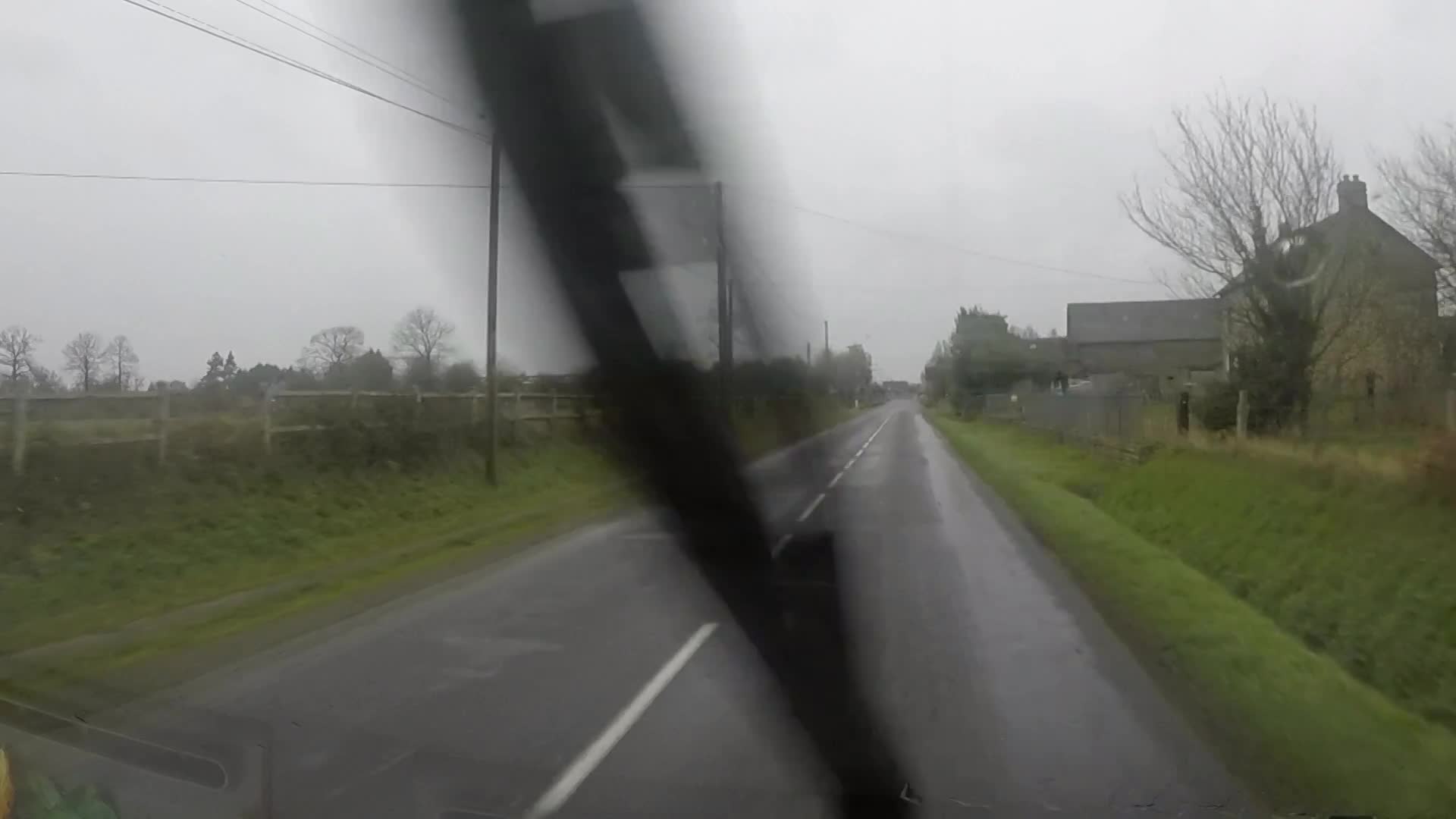 Sue had to get out of the van to check that the road was there, finding that it was, we continued down in 2nd gear to the main road and drove out of the town and across the open countryside as the drizzle continued to wash the wind screen.